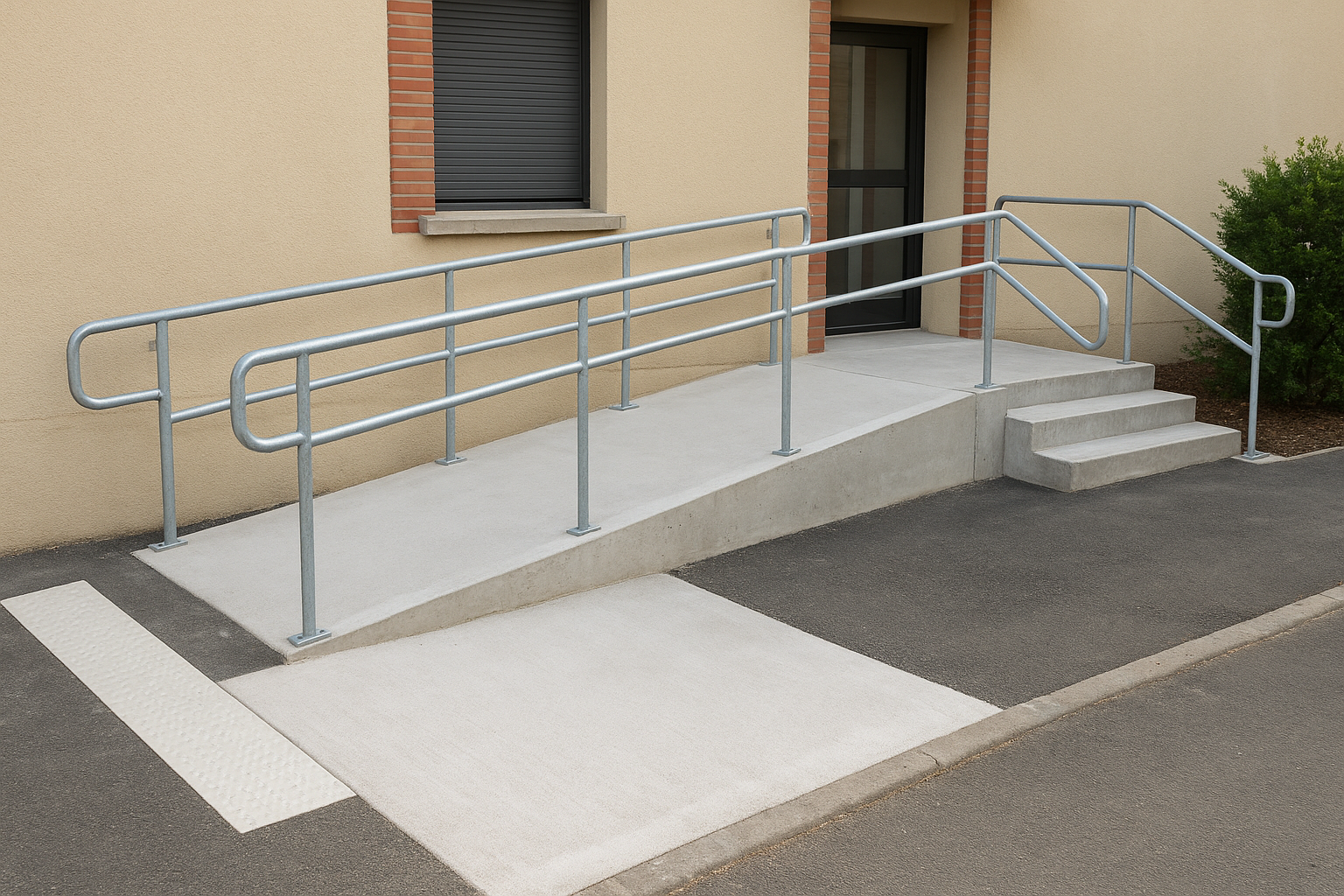 Nous intervenons régulièrement pour la mise en accessibilité de bâtiments communaux ou résidences. Des rampes et palier en béton armé proposent une durée de vie maximale pour les bénéficiaires de ces locaux associatifs et/ou municipaux. MBC a acquis une connaissance technique et normative quant à la réalisation de ces ouvrages. Certains cas de figure nous obligent à mettre en place des chasses roues ou encore garde corps, là aussi des normes explicites sont à prendre en compte. De la prise de côtes à la livraison finie MBC peut tout encadrer y compris les signalétiques horizontale et verticale. Des équipements prêts à l’ emploi (type rampe amovible) sont aussi posés régulièrement par nos équipes.