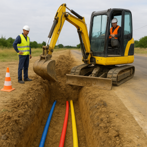 Pour des plombiers nous sommes régulièrement convié à créer des tranchées pour la mise en œuvre ou le remplacement de réseaux pour divers fluides. Exemple : chauffage, gaz, électricité. Après vérification auprès des concessionnaires concernés nous sommes à même de terrasser des tranchées pour le passage de tuyaux, fourreaux et gaines. La fourniture et la pose de ces supports peut nous être confiée. La fermeture des ces tranchées fait partie de nos attributions ainsi que les reprises de revêtements de sol (espaces verts, dallage béton armé, enrobé).